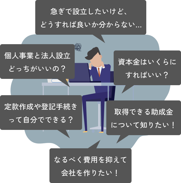 「会社設立の流れがわからない」「融資を受けながら会社を作りたい」 など、会社設立、法人化に関する疑問に応えます。