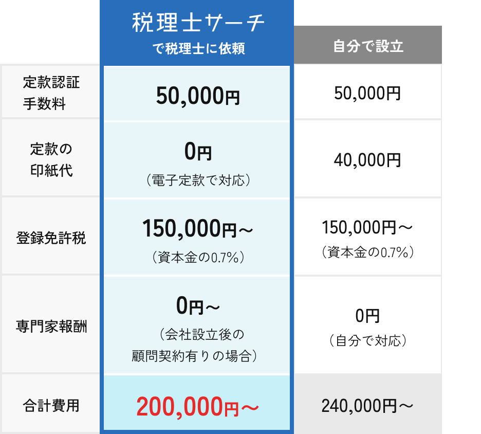 会社設立時に自分で手続きを行う場合と税理士に依頼する場合の大きな違いは、定款印紙代(40,000円)の有無です。電子定款を利用すると印紙代が不要になりますが、自分で電子認証を行うには専用機器や手続きが必要で、現実的ではありません。また、税理士に依頼すると専門家報酬が発生しますが、設立後の税務顧問契約を結ぶ場合、設立時の専門家報酬が0となり、結果的にトータルコストを抑えられることがあります。さらに、税理士は税務・資金調達・節税対策などもサポートできるため、設立後の経営を見据えて依頼するメリットは大きいと言えるでしょう。